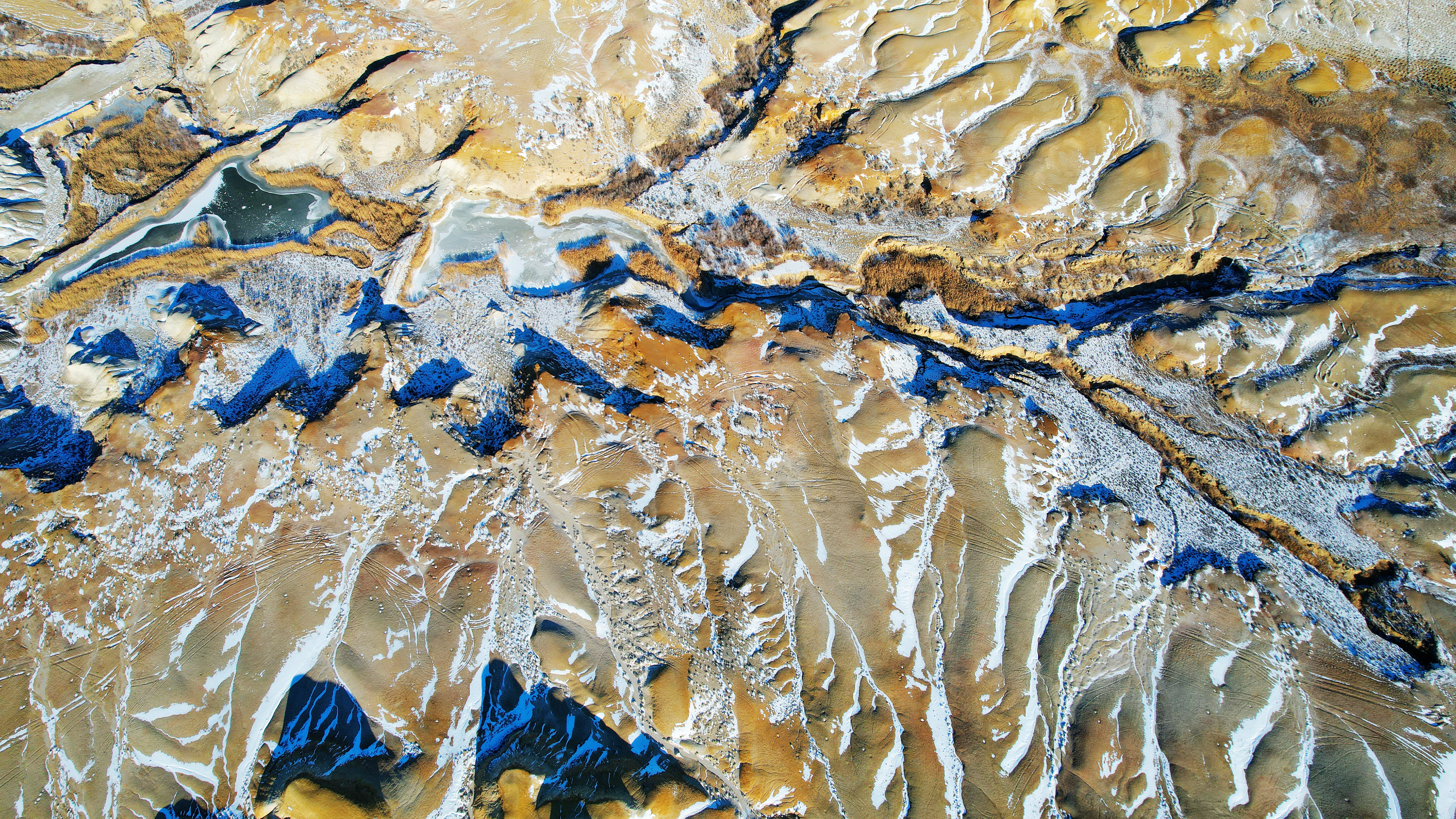 近日,福海县降下入冬后的第一场雪,洁白的雪花覆盖在湖边的雅丹地貌之上,与湖水形成一幅幅绝美的画卷。