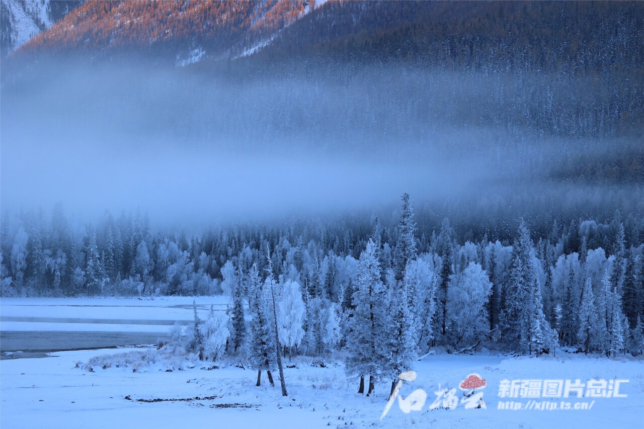 清晨的喀纳斯景区神仙湾,沿河两岸的树梢上挂满冰晶雾凇,玲珑剔透,构成了一幅美丽的冬日画卷(资料图)。徐光健摄