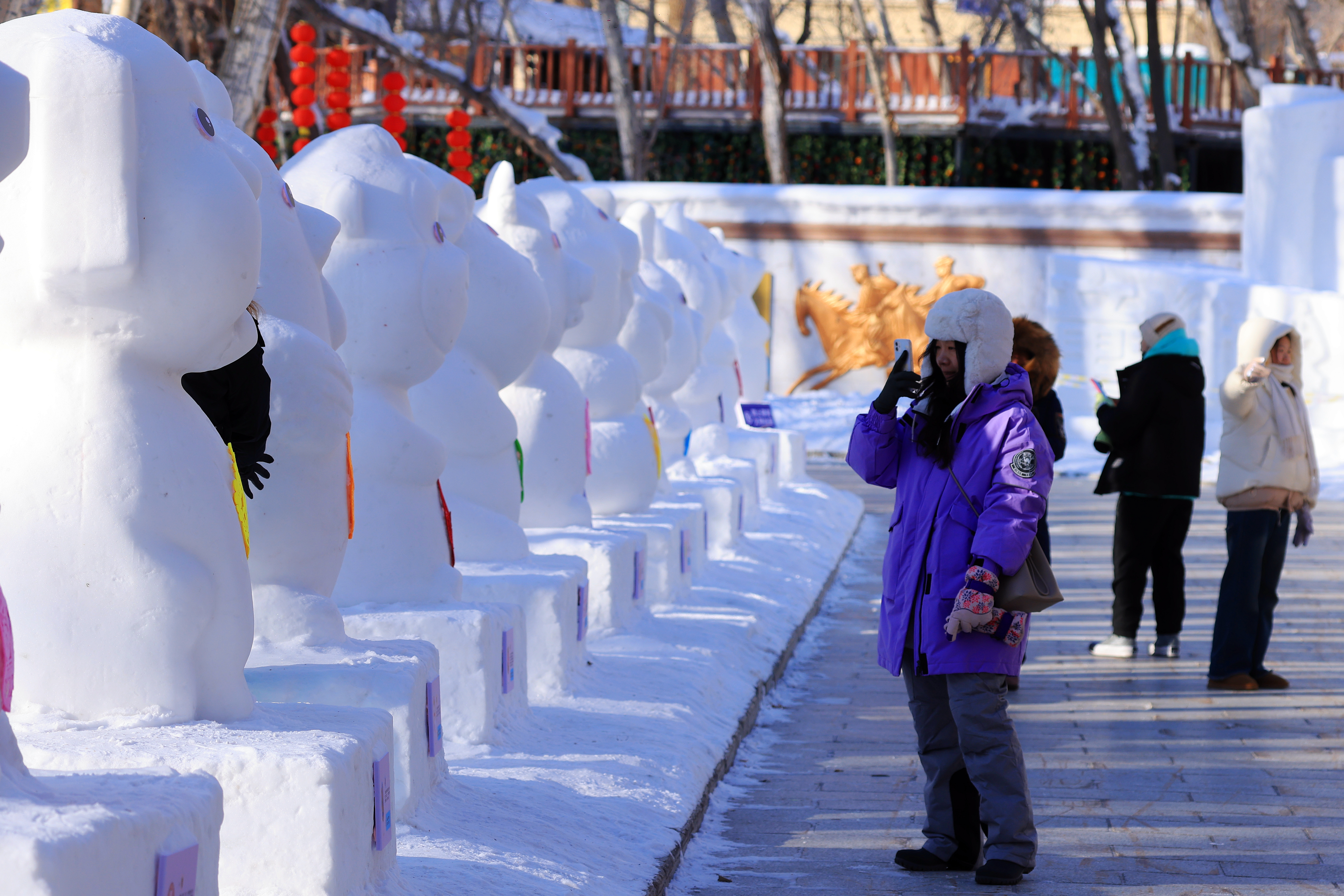 在阿勒泰市金山广场内,雪雕成为一道亮丽的风景。雪怪阿乐、锦鲤、中国龙等形态各异的雪雕栩栩如生、憨态可掬。一旁的红旗排列整齐,新年标语、福字、中国结等春节饰品点缀其间,让市民们感受到了浓郁的“年味儿”。