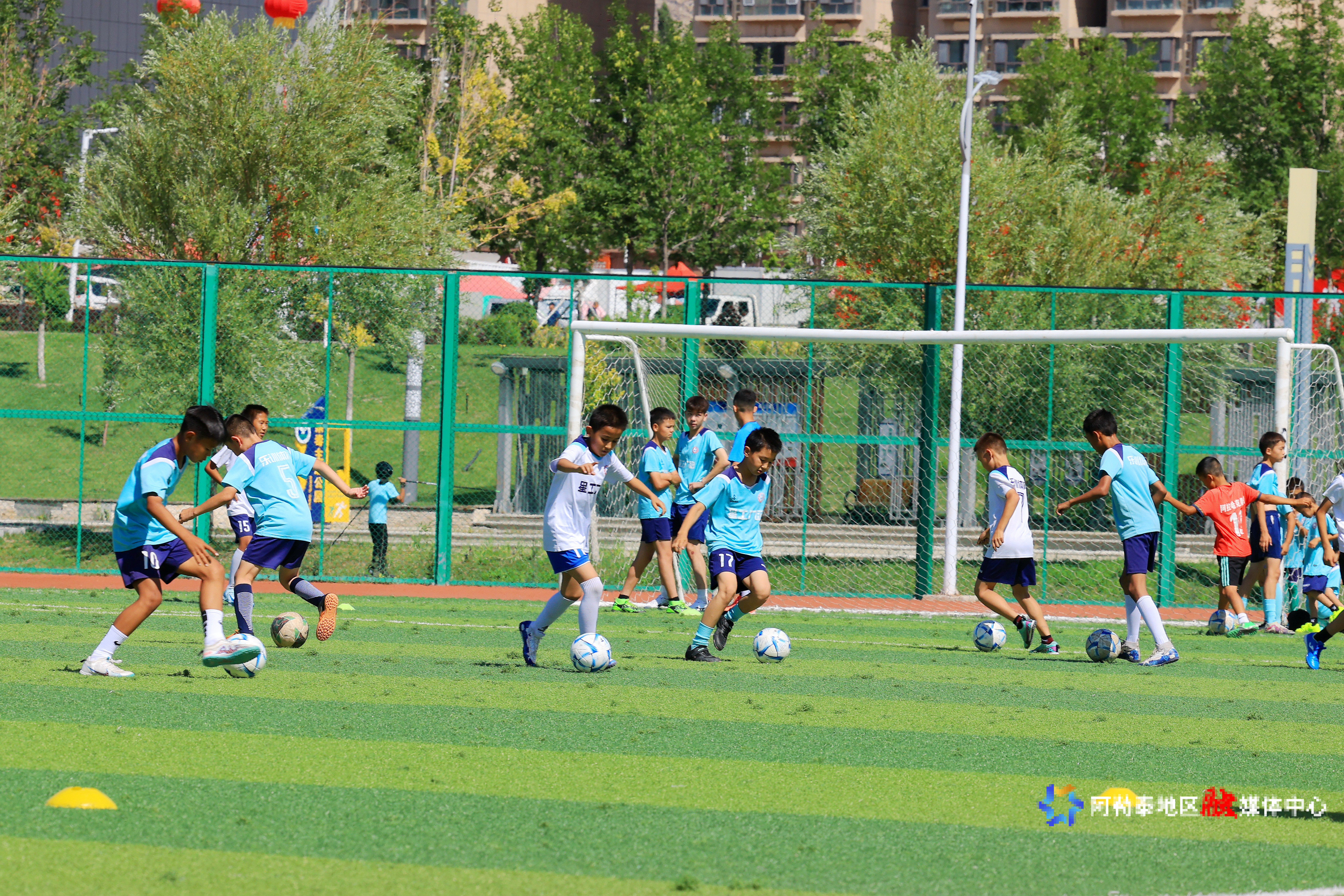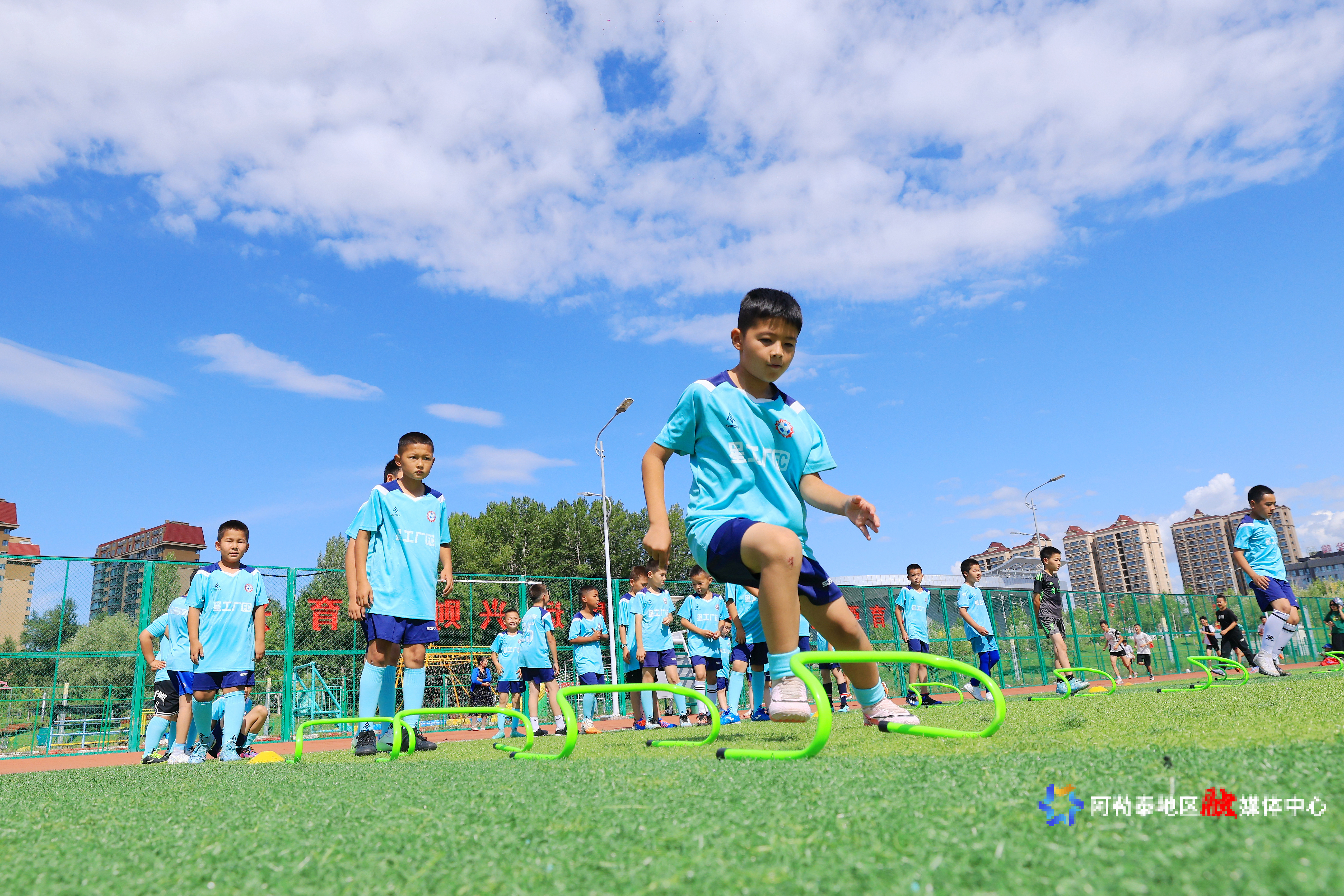 2025年7月2日,阿勒泰市小朋友们正在进行足球训练。记者 阿尔达克·拜斯汗 摄
