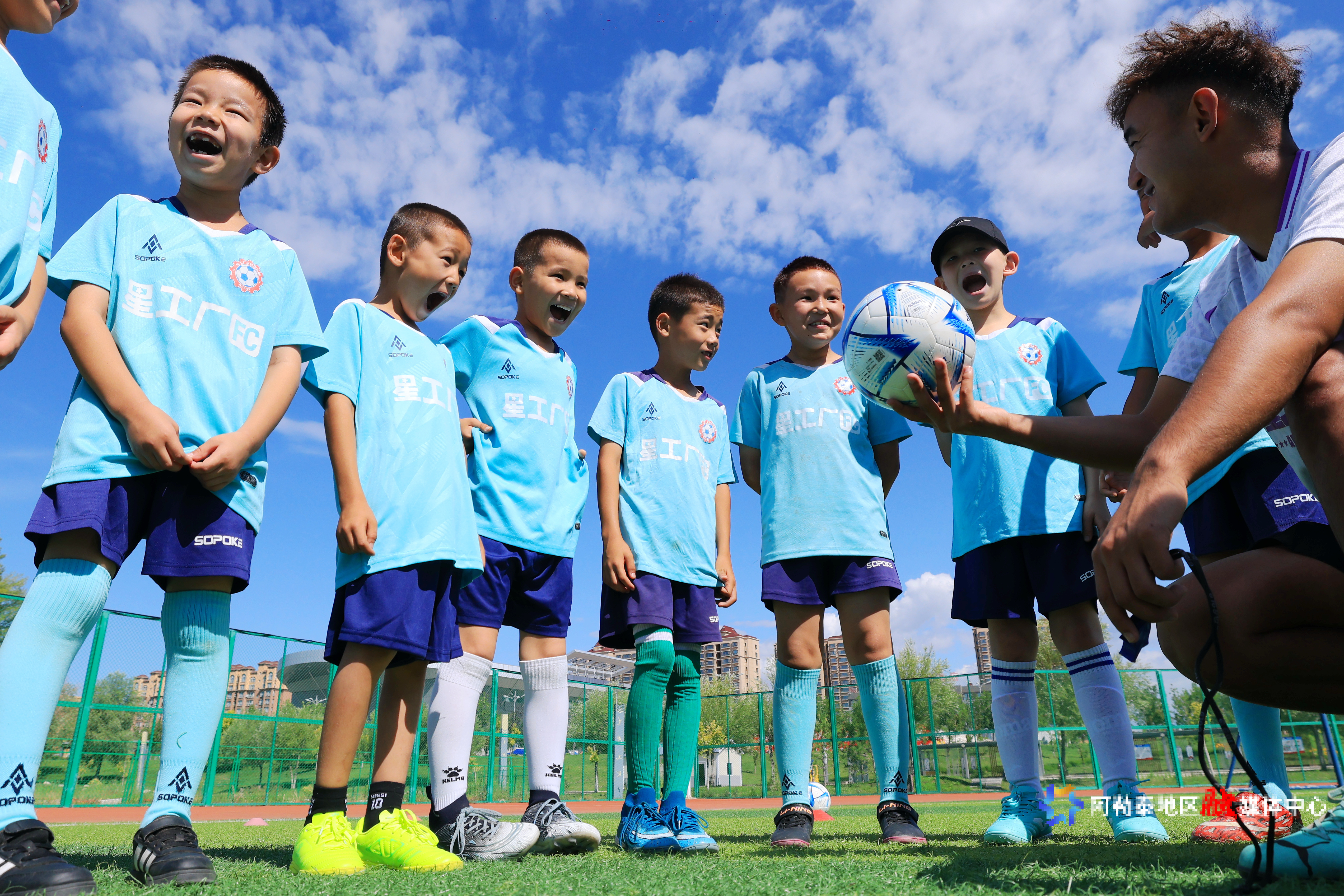 阿勒泰新闻网-阿勒泰地区融媒体中心(记者 阿尔达克·拜斯汗)7月2日,阿勒泰市全季体育公园迎来暑期少儿足球夏令营。在教练员的指导下,孩子们进行了热身、球感练习、传接球技巧和小型对抗赛等。绿茵场上,小球员们尽情挥洒汗水,脸上洋溢着快乐的笑容。