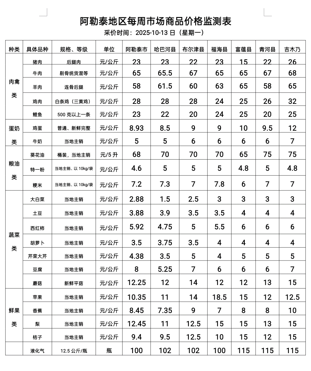 阿勒泰地区每周市场商品价格监测表