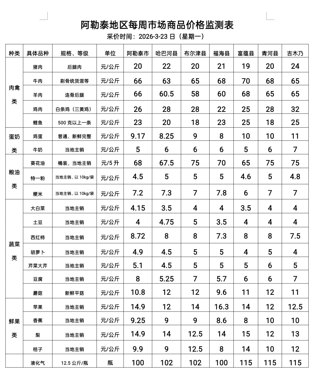 阿勒泰地区每周市场商品价格监测表