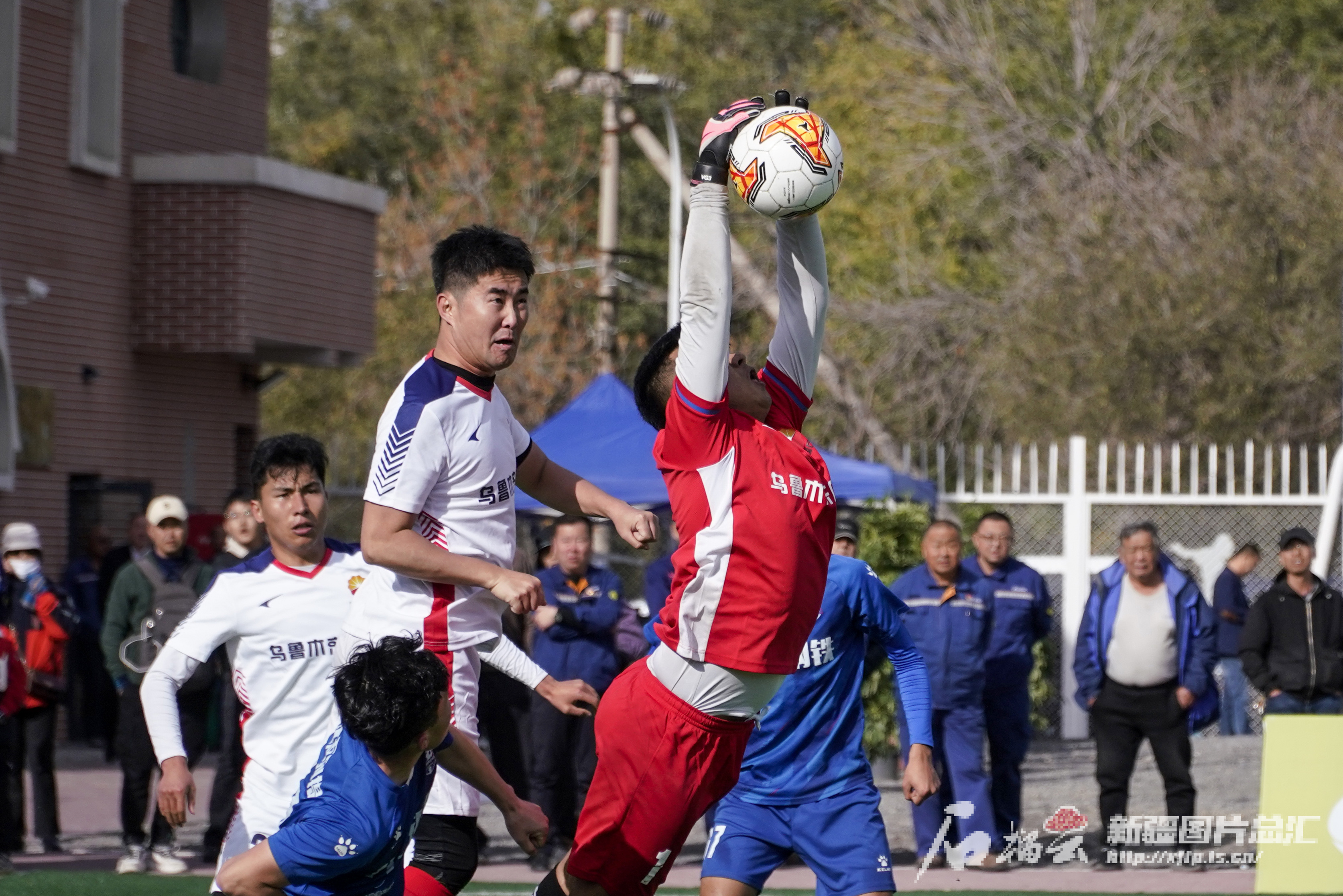 10月19日,新疆“工会杯”2024年度职工运动会足球比赛乙组决赛中,中国石油乌鲁木齐石化公司工会足球代表队守门员奋力扑救。石榴云/新疆日报记者 杨伟摄