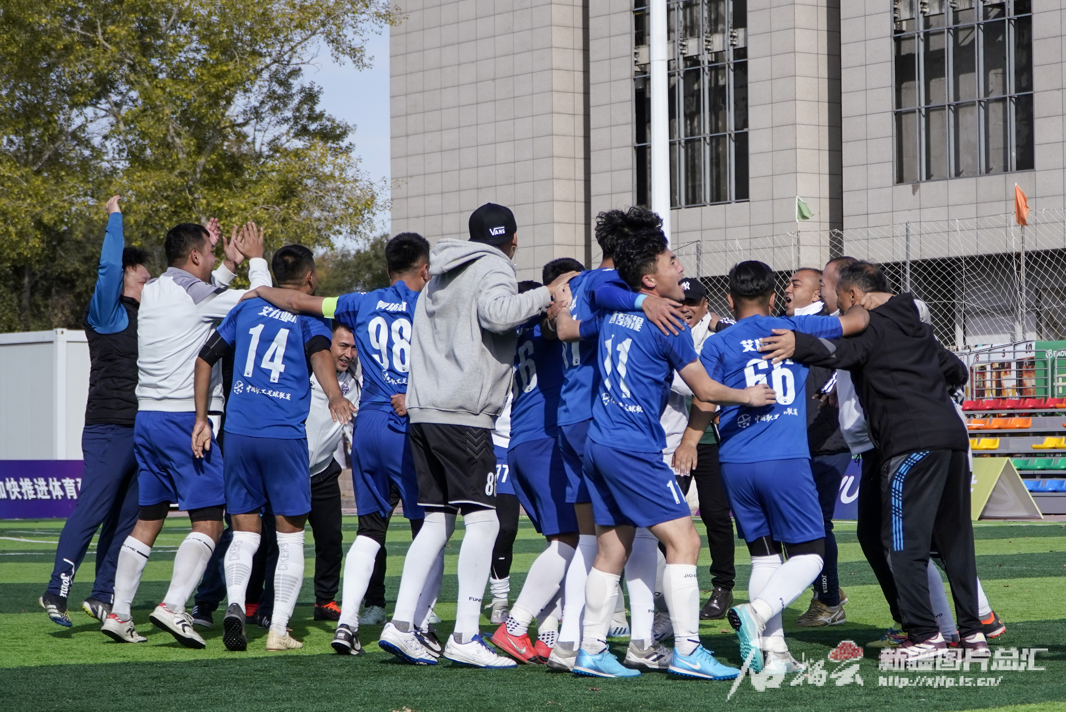 10月19日,新疆“工会杯”2024年度职工运动会足球比赛乙组决赛中,八钢公司工会足球代表队球员在获胜后相拥庆祝。石榴云/新疆日报记者 杨伟摄