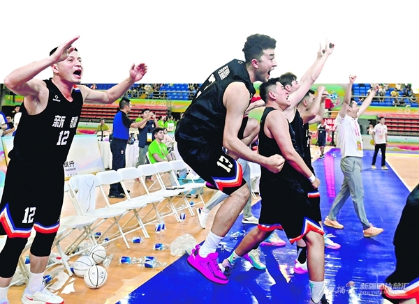 11月23日,第十二届全国少数民族传统体育运动会珍珠球比赛小组赛,新疆队以40∶39战胜浙江队,取得小组赛开门红。图为新疆队队员欢呼雀跃。
