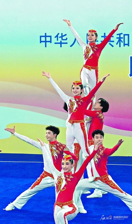 11月25日,新疆代表团民族健身操队队员正在比赛。