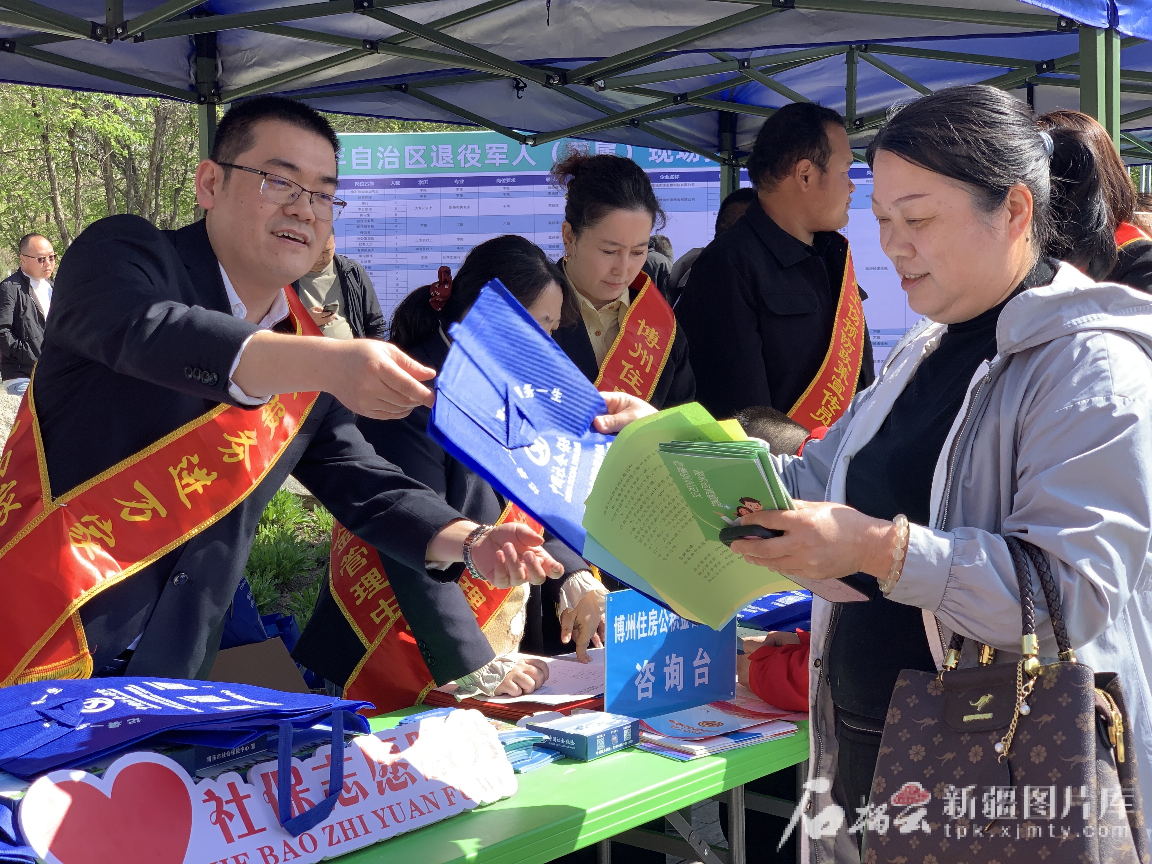 4月18日,博乐市社会保险中心“微笑社保”志愿服务队开展“社保服务进招聘会”宣传活动。图/博乐市社保中心提供