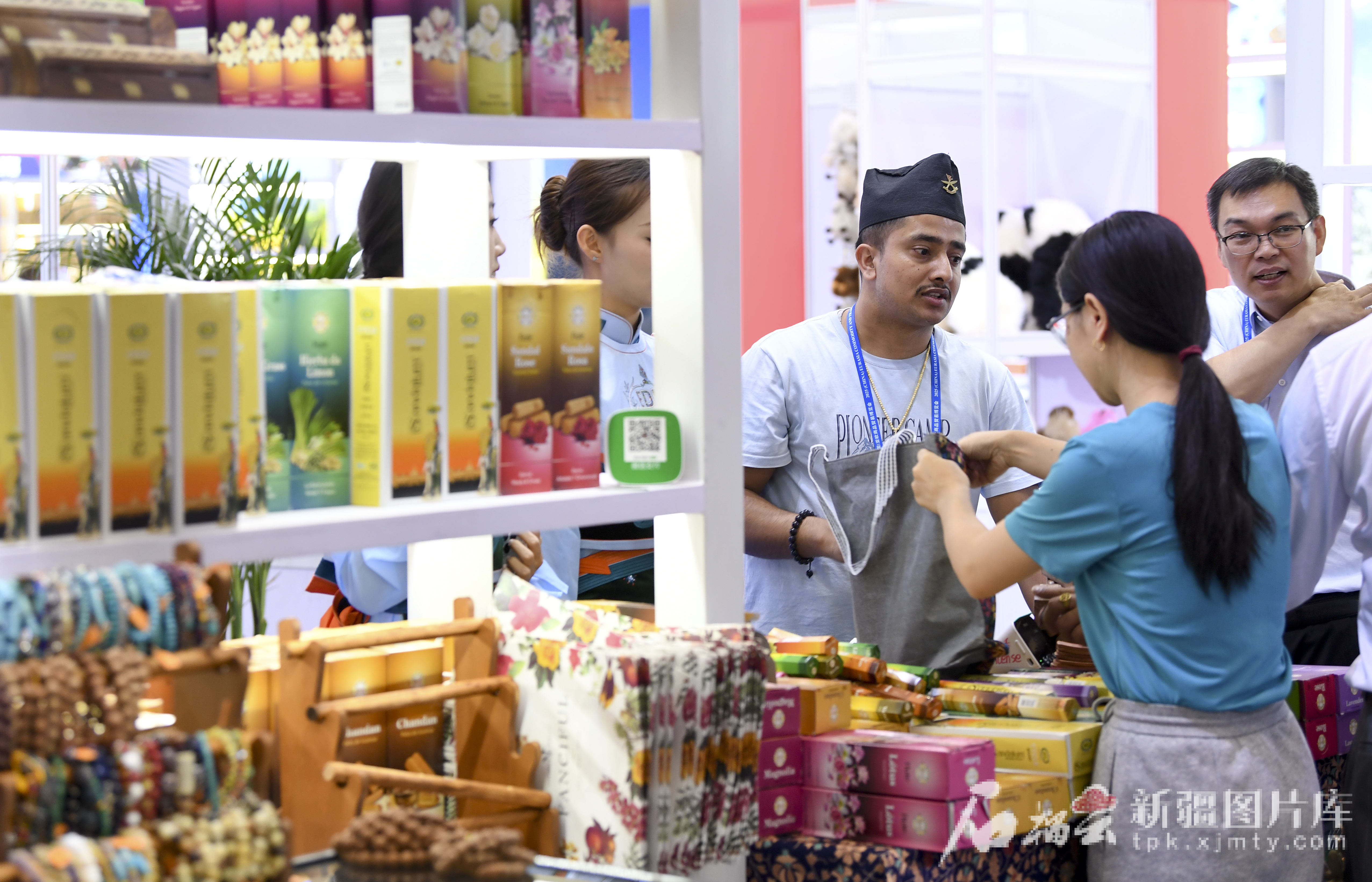 6月28日,参观者在尼泊尔商品馆选购香料制品。