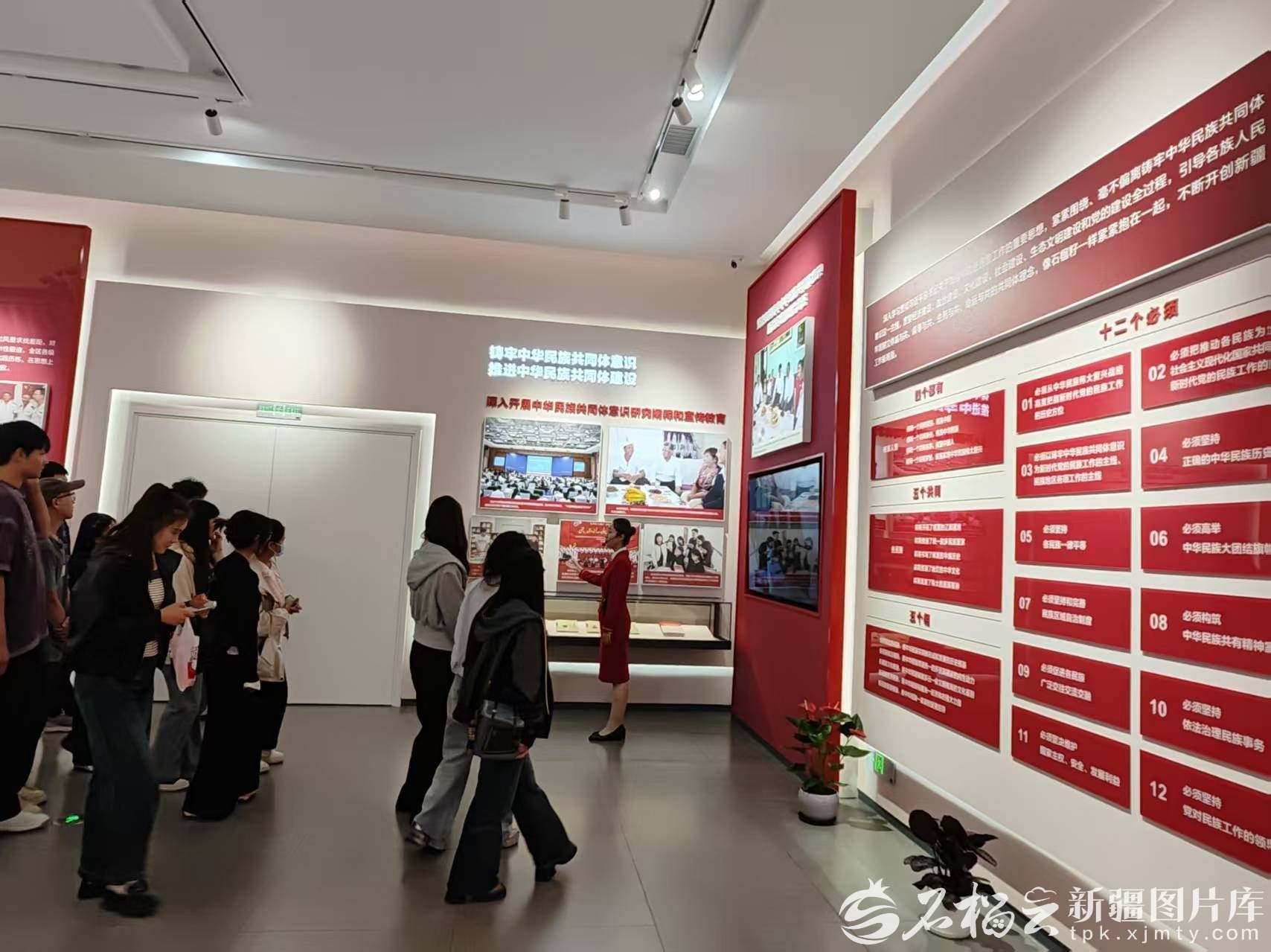 铸牢中华民族共同体意识宣传教育的展板,用一幅幅仿若昨日的照片、一本本印刷精美的书籍、一段段感人至深的视频,从深入开展中华民族共同体意识研究阐释和宣传教育、坚决扛起铸牢中华民族共同体意识新疆实践的政治责任、坚定不移推广普及国家通用语言文字、持续拓展交往交流交融的广度深度等方面,对新疆有形有感有效铸牢中华民族共同体意识进行具象呈现。