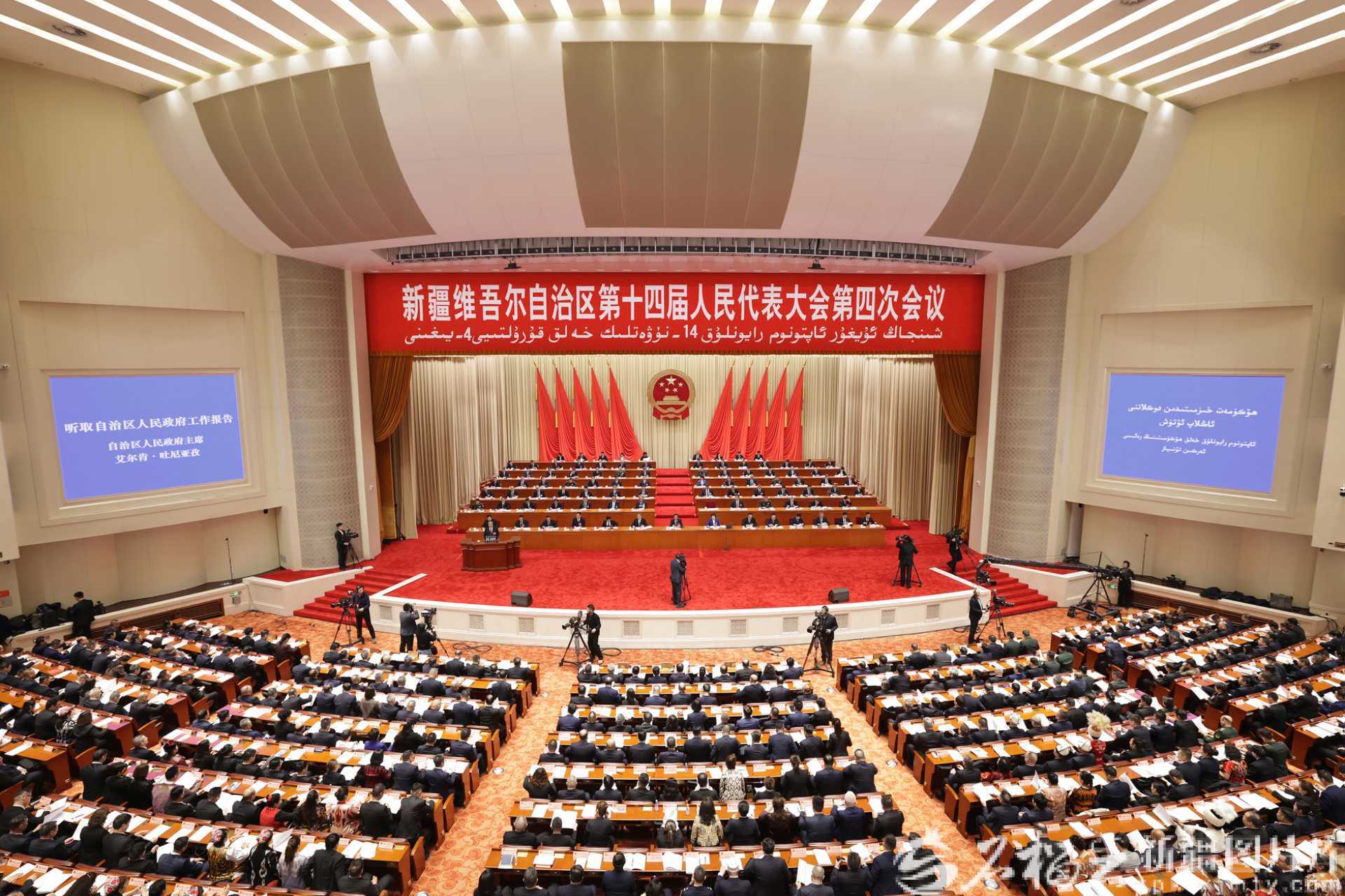 1月27日,自治区十四届人大四次会议在新疆人民会堂开幕。图为会议现场。石榴云/新疆日报记者 崔志坚摄