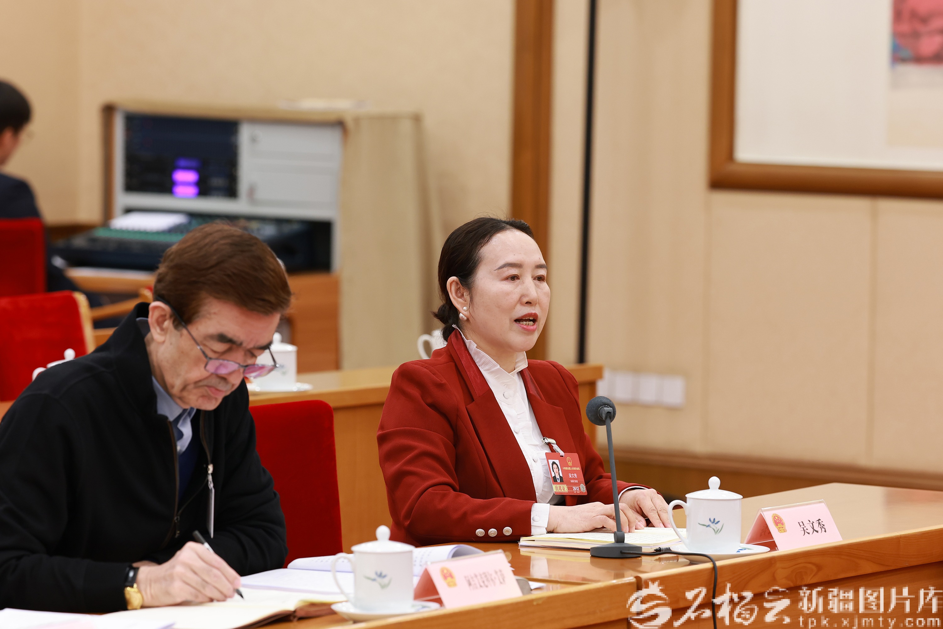 3月8日上午,十四届全国人大四次会议新疆代表团举行小组会议,审议生态环境法典草案。图为吴文秀代表(右)围绕建设美丽乡村等内容发言。天山网-新疆日报记者 崔志坚摄